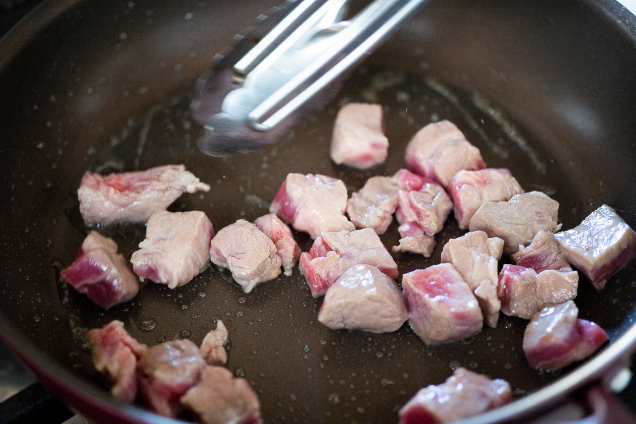 トマト缶ではなくトマトペーストを使うのは、ペーストの方がうまみ成分がぎゅっと濃縮されているから。トマトの味をつけるのではなくて、うまみやコクを料理に足すために入れています。