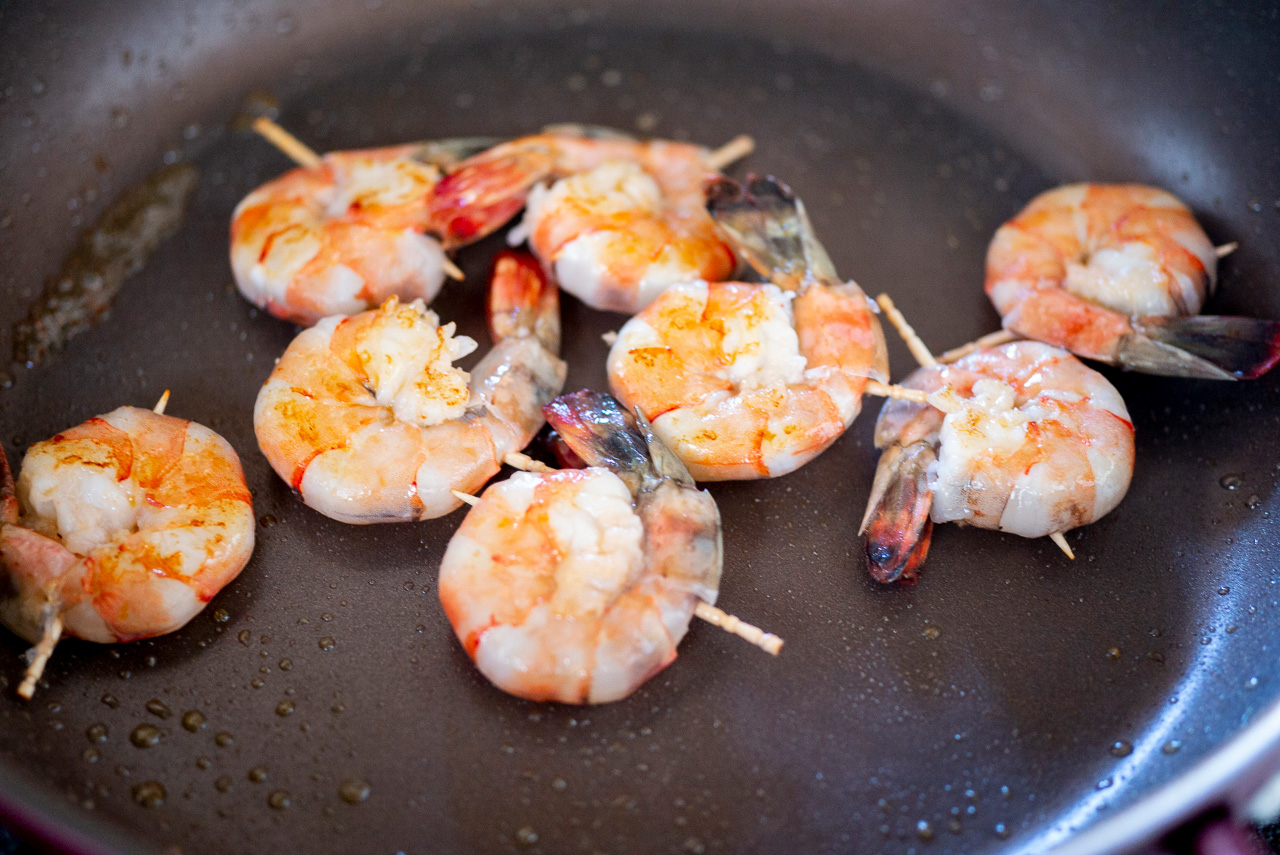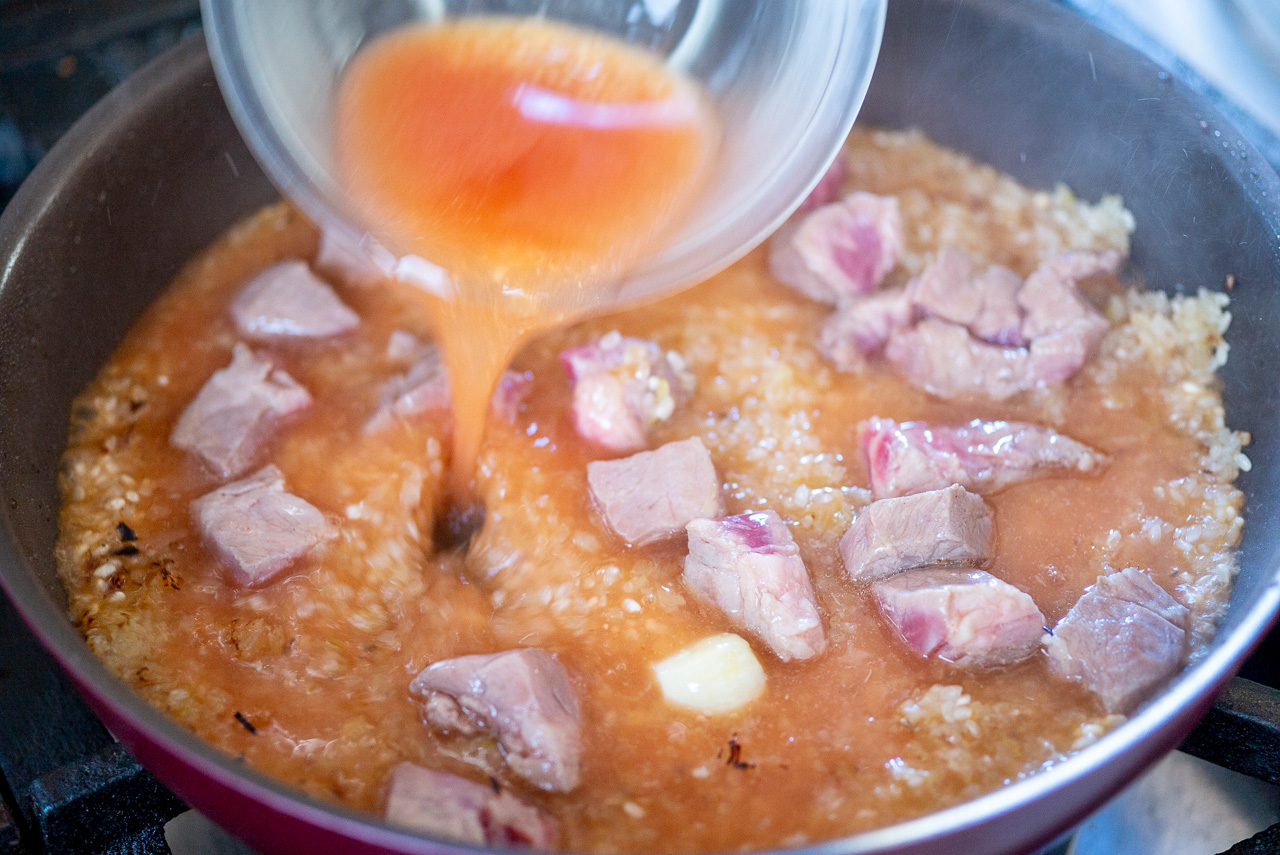 最初の工程からずっとフライパンを洗わずに使い続けることも、パエリア作りのポイントのひとつ。豚肉やえびを焼いたときに出たエキスもそのまま使います!