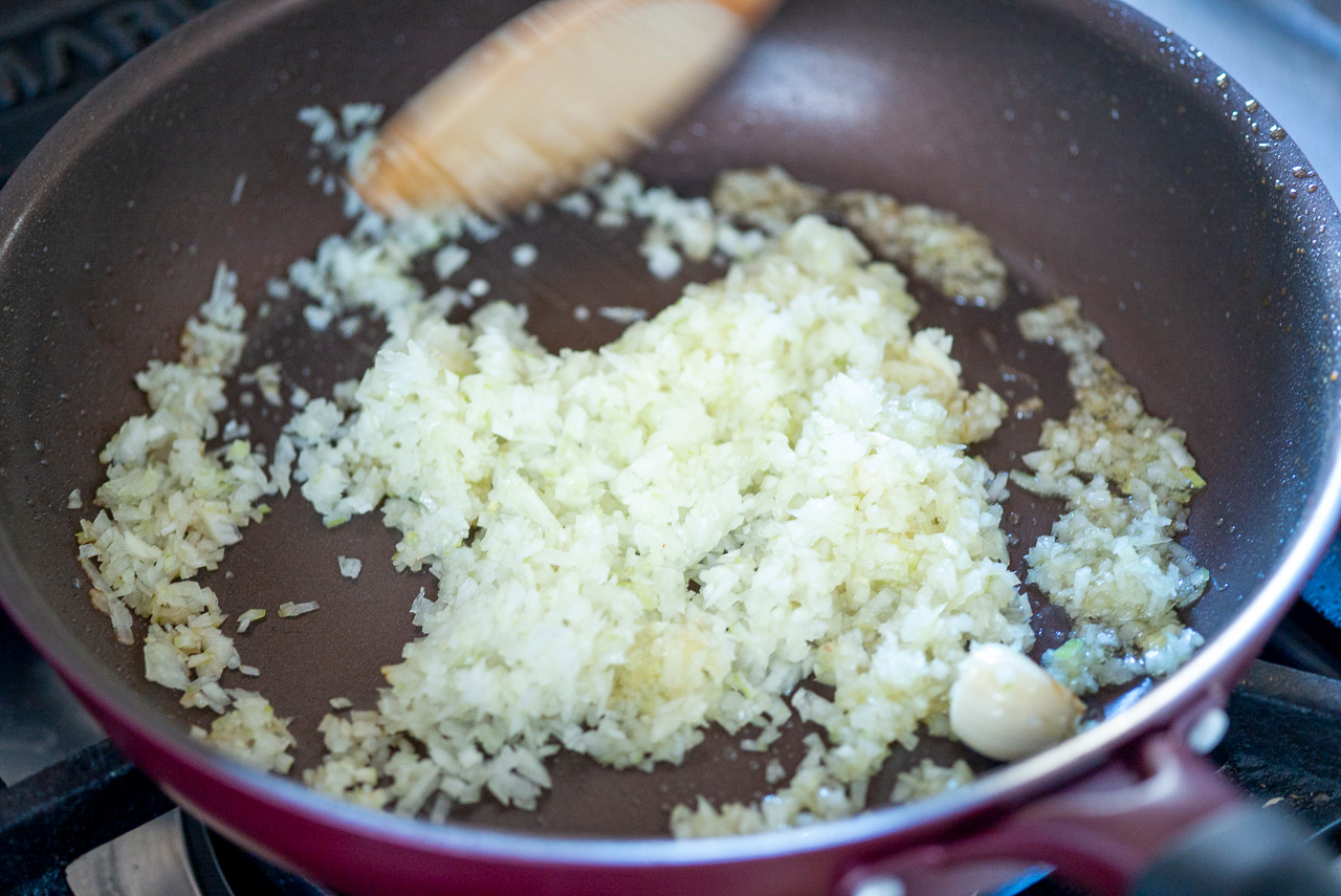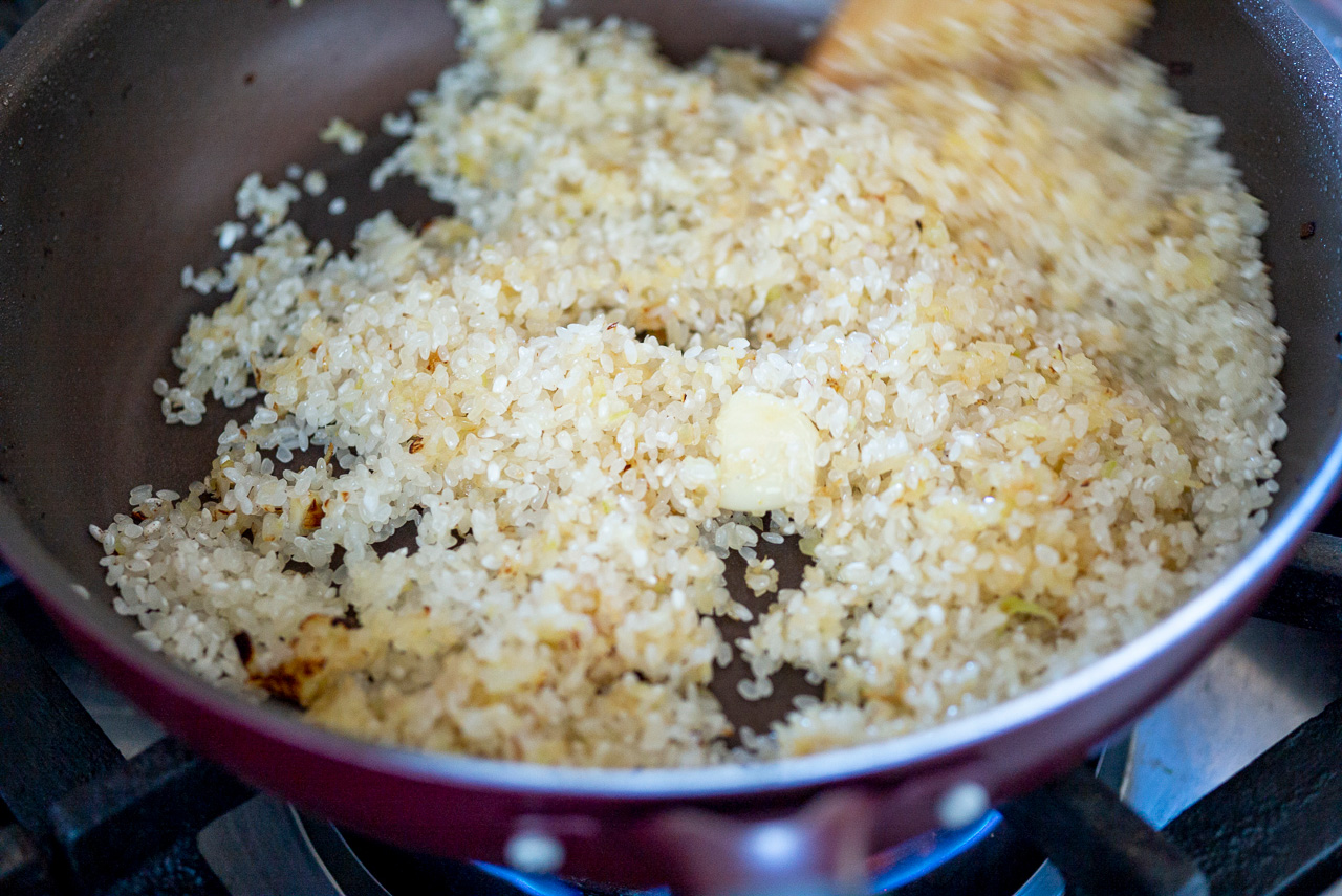 【4】3のフライパンにオリーブオイルとにんにくを入れ、弱火にかける。香りがしてきたら、玉ねぎをしんなりするまで炒める。そこに米を入れ、全体を混ぜ合わせるように炒める。