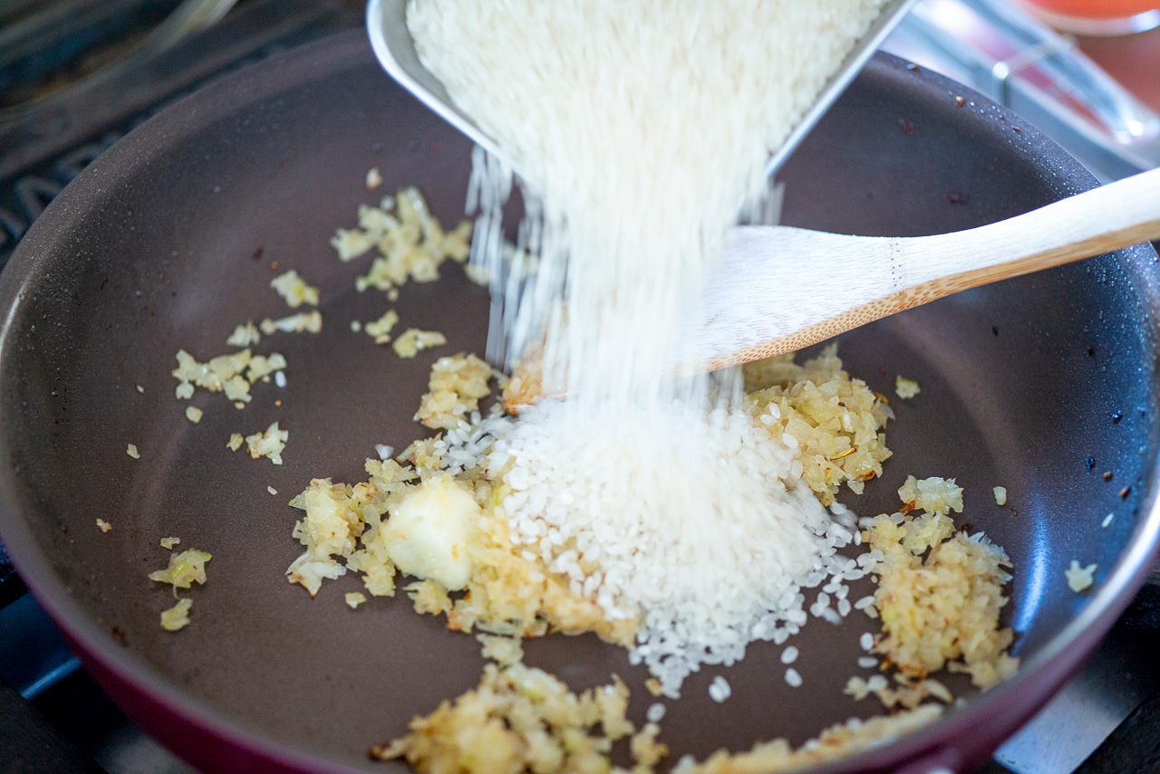 お米は研がずにそのまま入れましょう。研いで水分を含んだお米はアルデンテの食感になりにくいため、乾いた状態で入れるのが大切です!