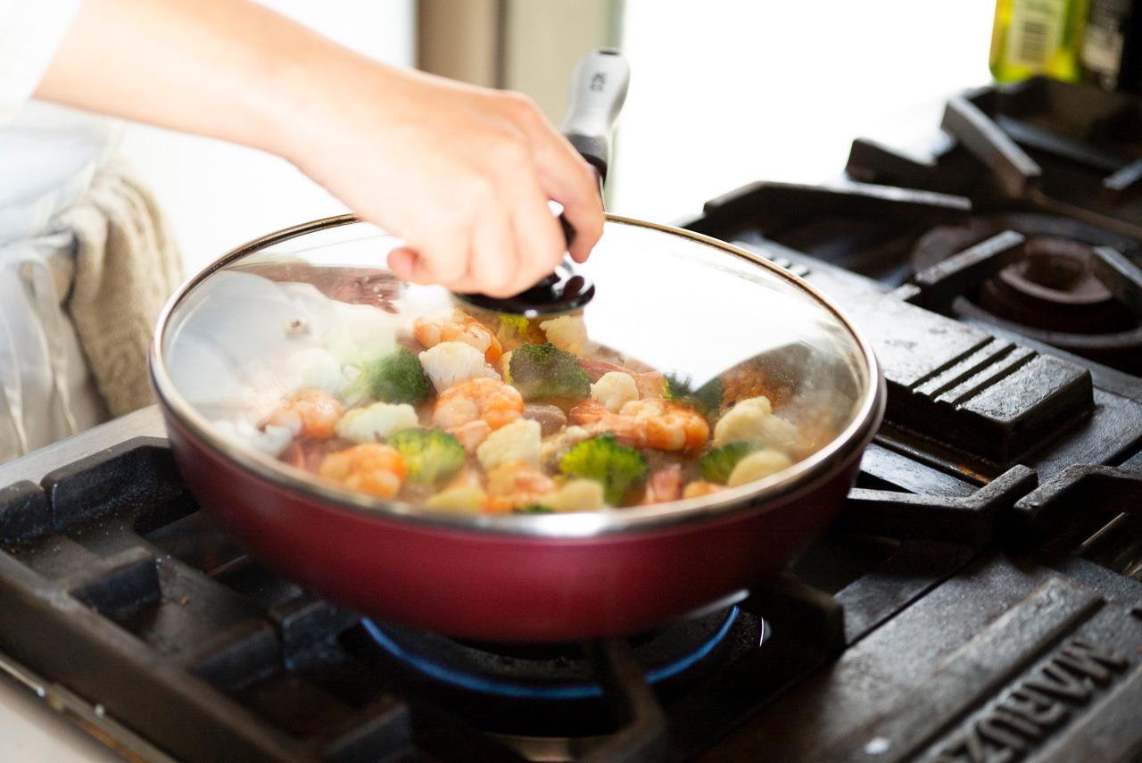 【6】煮汁がまだ少し残っている状態でブロッコリーとカリフラワー、火を通したえびを加え、再びフタをして煮汁がなくなるまで煮る。