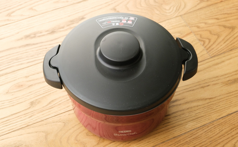 【6】調理鍋にフタをして保温容器に入れ、2時間たったら取り出す。調理鍋のフタを取り、弱火にかけ、また60℃くらいになるまで温める。保温容器に再び戻し入れる。これを4~5回繰り返す。