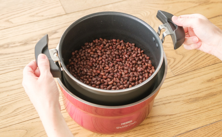 シャトルシェフは、小豆の状態を見ながら火にかけたり保温容器に入れたりできるのがいいですね。小豆が炊けたら、次は戻した米こうじと合わせて仕上げていきます!