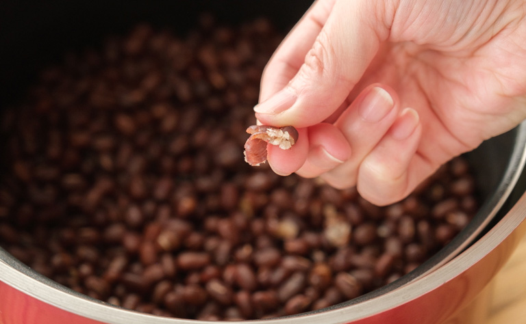 【3】小豆が指で簡単に潰れるくらいになったら炊き上がり。まだかたければ、調理鍋のフタをせず再び中火にかけ加熱する。このときも、途中で水が少なくなったら、小豆がヒタヒタになるくらいまで足す。