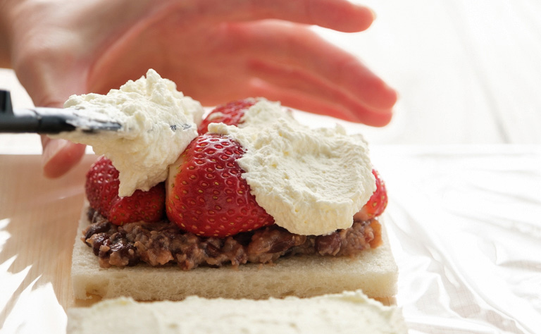 【2】食パンに発酵あんこを塗り、いちごを並べる。もう1枚の食パンに【1】のクリームを塗る。