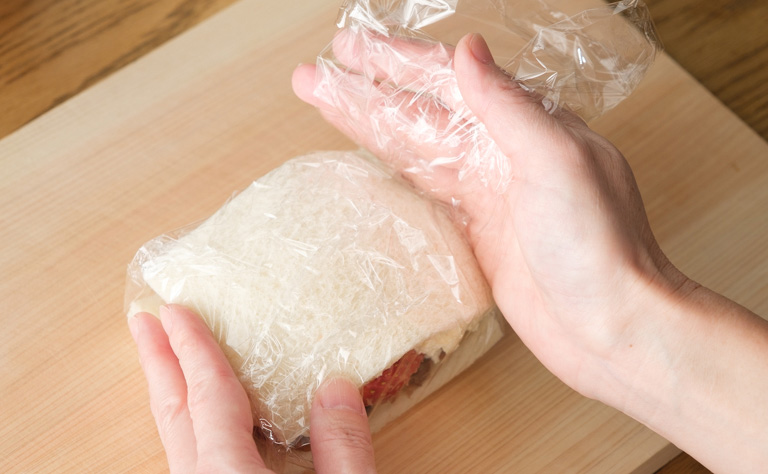【3】いちごのすき間にクリームをのせ、パンでサンドし、ラップできっちりと巻き、冷蔵庫で3時間くらい寝かせる。