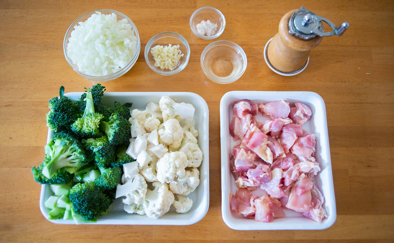ブロッコリーとカリフラワーは、水を張ったボウルに逆さまに入れて15分ほど浸すと汚れが浮いてきます。ブロッコリーって茎が甘くておいしいんですよ。筋っぽいところを取り除く必要がありますが、ぜひスープに入れてみてください。鶏モモ肉は分量外の塩コショウで下味をつけて、タマネギとニンニクは粗みじん切りにしておきましょう!