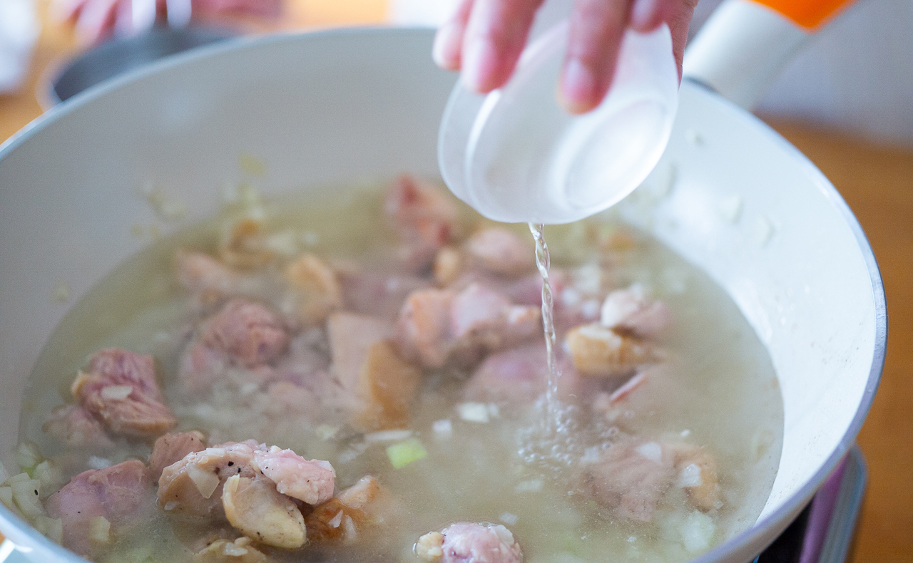 白ワインなら酸味が隠し味に、日本酒なら甘みがコクになります。鶏肉特有の匂い消しにもなるので、ご自宅にあるようならどちらかを入れてください。