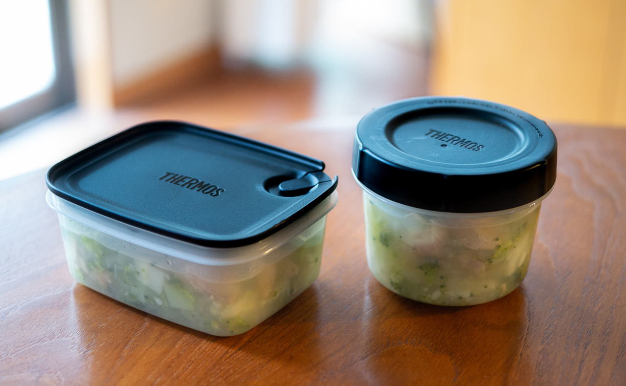 ▲サーモスの保存容器KC-RA500(下)とKC-SA380(上)はパッキン付きでスープの保存も安心