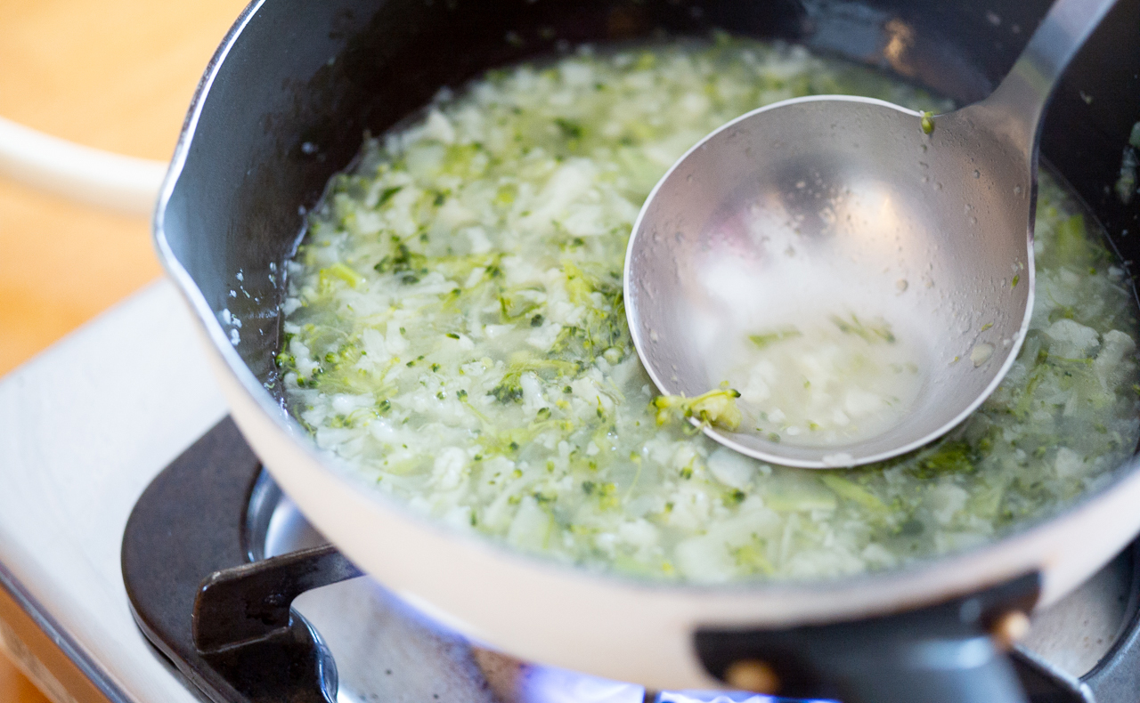【1】 ストックしておいた「ブロッコリーとカリフラワーのスープ」を鍋に移して火にかけ、ぐつぐつしてきたら具材をお玉で崩す。