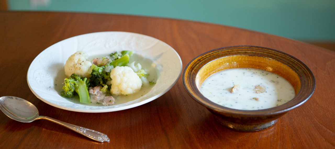 ブロッコリーとカリフラワーは、どちらも冬が旬。甘みが乗ってきておいしいですよ。それに両方ともビタミンCが豊富に含まれているから、冬の風邪予防にもぴったり。スープにすると、ホロホロと柔らかくなってたっぷり食べられるし、からだの中から温かくなって元気が湧いてきますよ。