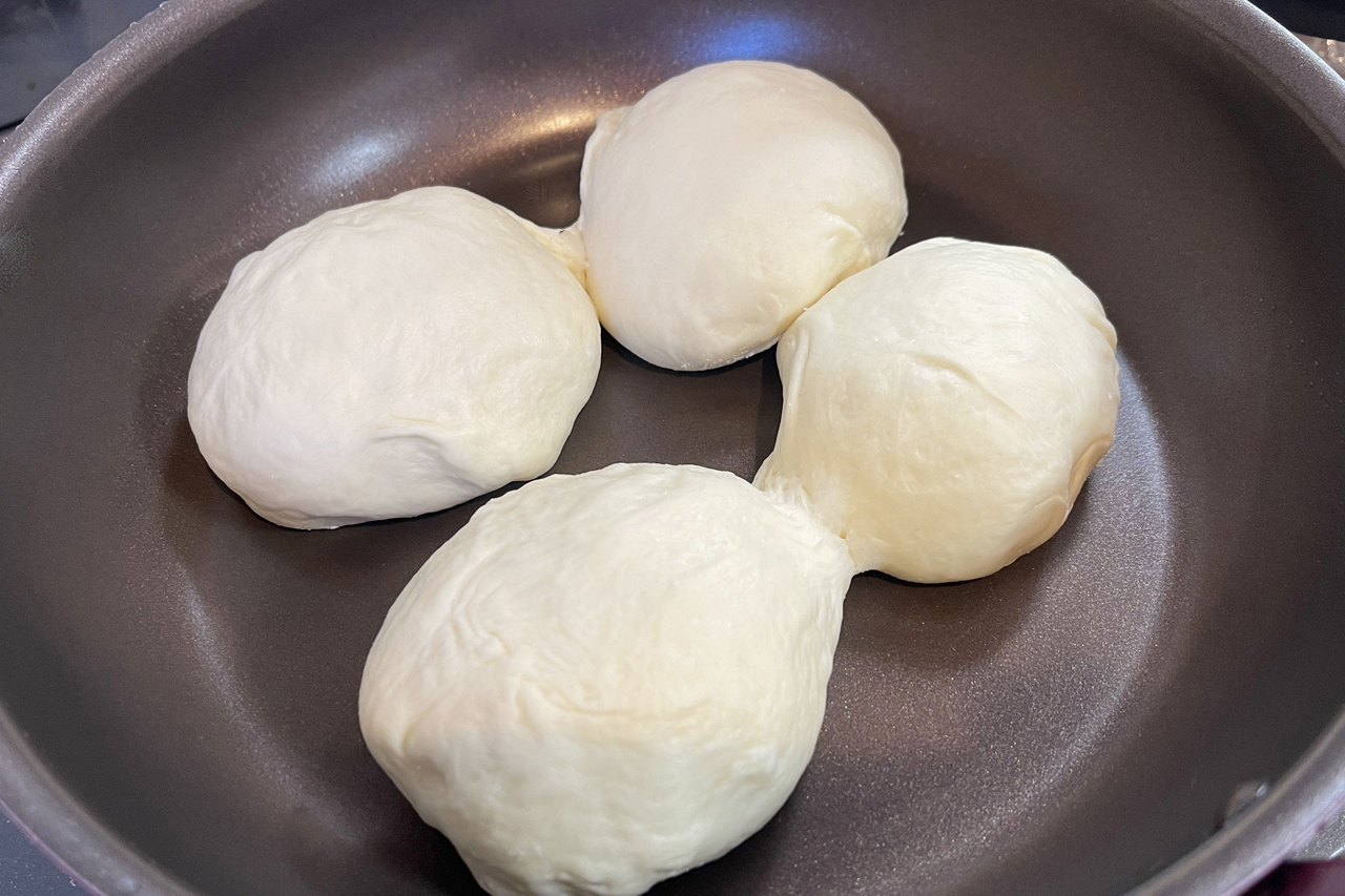 お好みのパンのレシピにならって、材料を混ぜて発酵させて、生地をこねたら、オーブンではなく、フライパンに並べてみました。