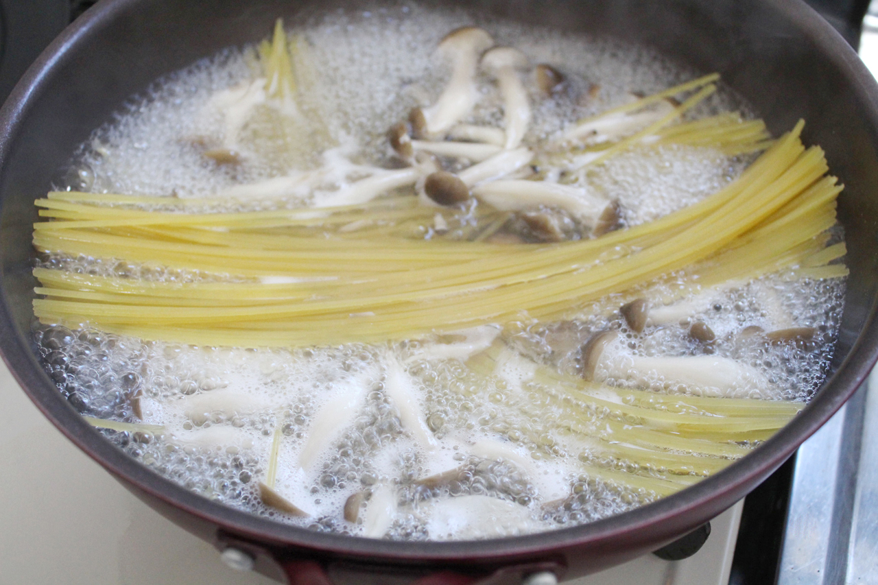 パスタがフライパンにうまく入れられなさそうであれば、パキッと割って半分の長さにして入れてもOK。具材がぐんぐんと水分を吸い上げていく様子をほおおっと眺めていたら、あっという間に和風パスタが仕上がりました。