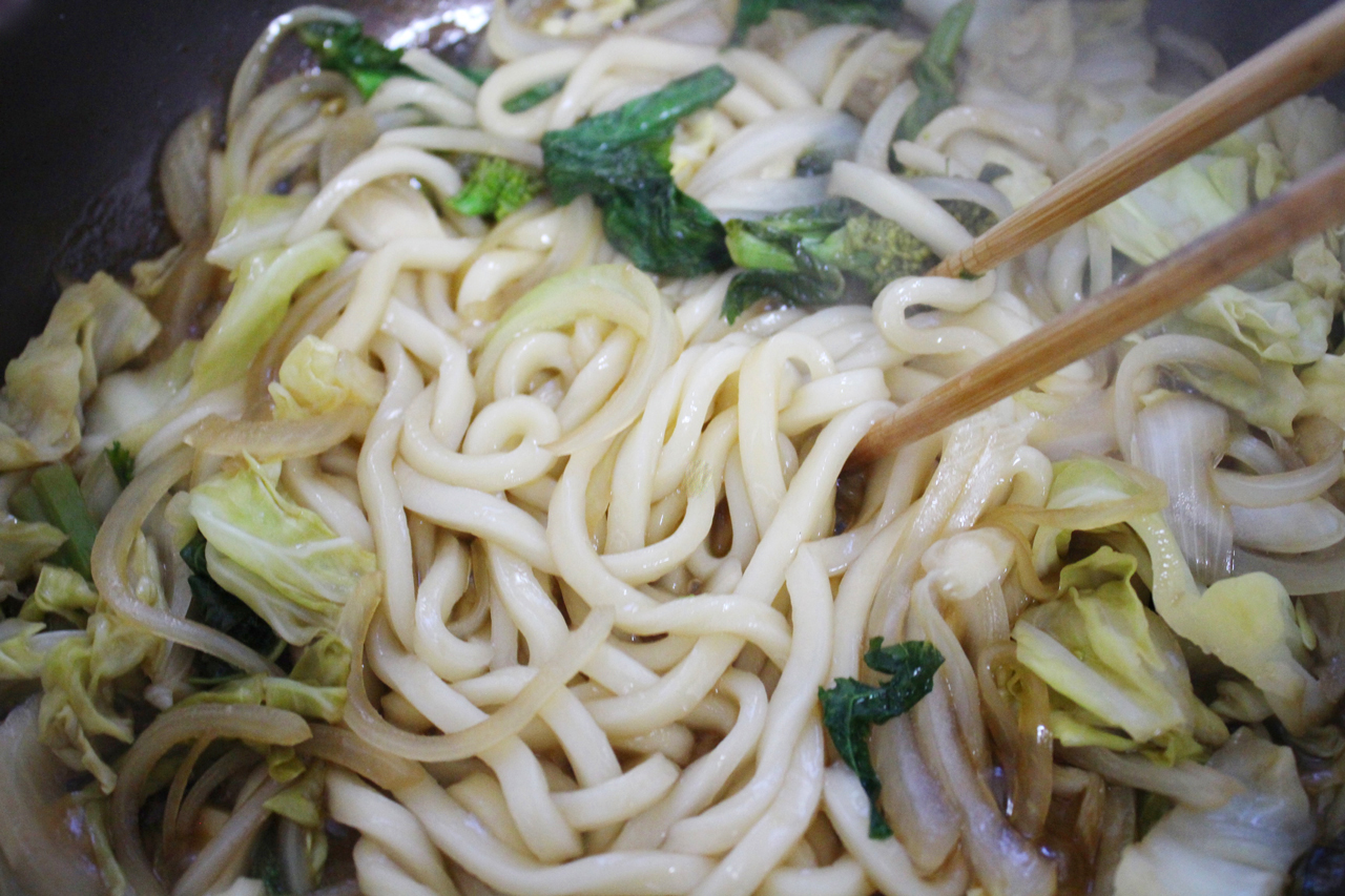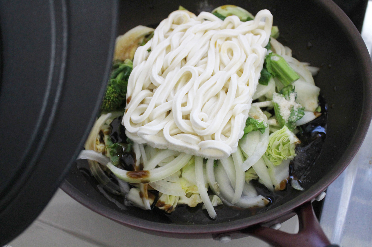 ものの数分で完成。焼きうどんというよりも蒸しうどん、という様相になりました。忙しいけど、栄養はしっかり摂りたい。そんなときに気軽に試したい調理法です。