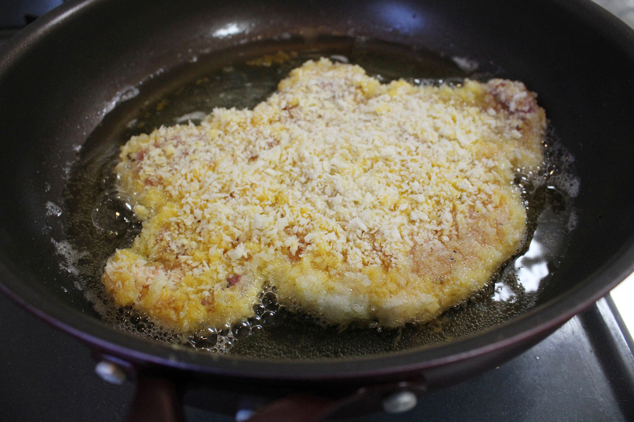 フライパンで揚げることのメリットは少ない油で揚げられること。なかでも特に向いているのが、薄くて大きい食材の調理なのではないでしょうか。そんな仮説をもとにカツレツを作ってみます。