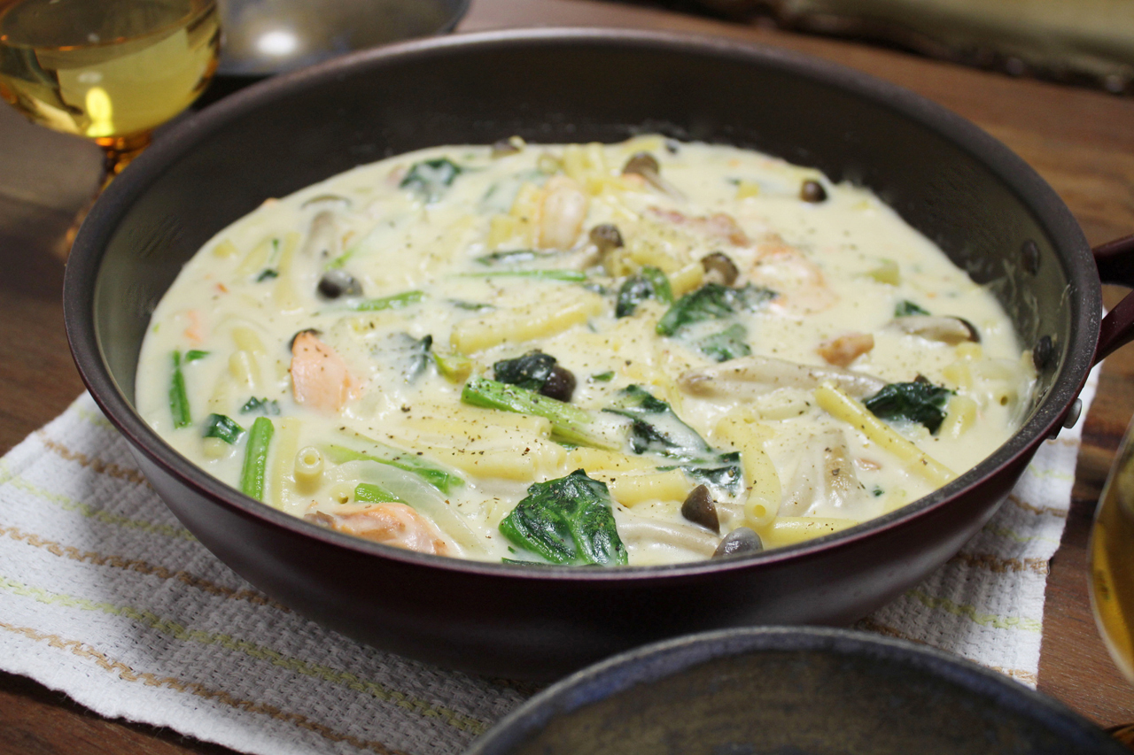 「ワンパンパスタ」という言葉を耳にする機会が増えました。ワンパンとは、フライパンひとつで作れること。パスタを茹でる工程、具材やソースを和える工程などを一貫してフライパンで行い、ほかの調理器具を使わずに完成させるのです。