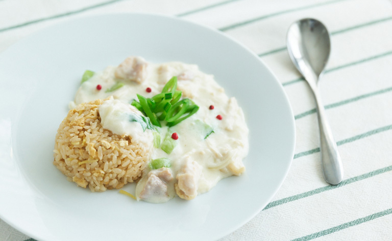 ベジブロスをふんだんに使った「クリームソース添えしょうがご飯」の完成です!