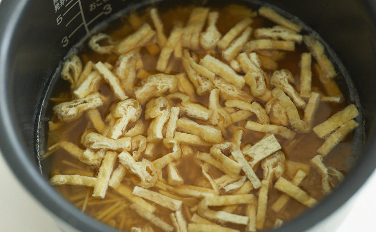 【3】 油揚げとしょうがを上に乗せたら、オリーブオイルを回し入れ、早炊きモードで炊飯する。
