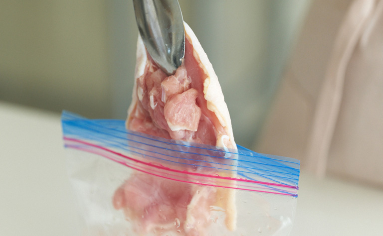 塩にはたんぱく質を分解する効果があり、砂糖には保水効果があります。 やわらか液にお肉を漬けておくことで、しっとりとやわらかな仕上がりになるんです。漬ける時間は2時間〜1晩くらいが目安です。あらかじめ小さく切って漬ける場合は、1時間程度でもOK!