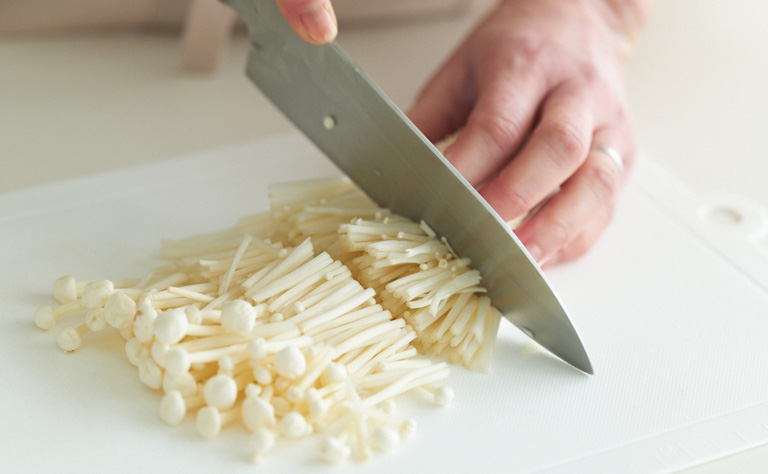 【2】 玉ねぎは薄切りに、えのきだけは適当な大きさに切る。チンゲン菜はざく切りにし、葉と根本の部分に分けておく。