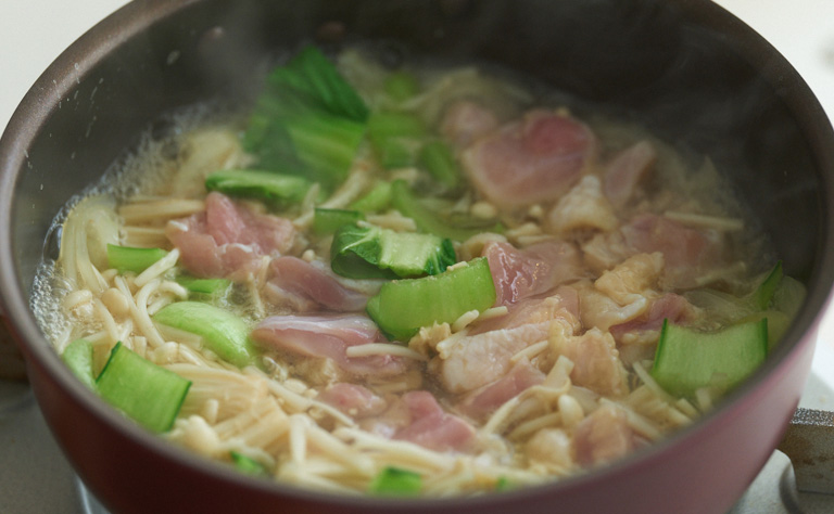 【3】 鍋にベジブロスと塩を入れ、鶏肉・玉ねぎ・えのきだけ・チンゲン菜の根本を茹でる。