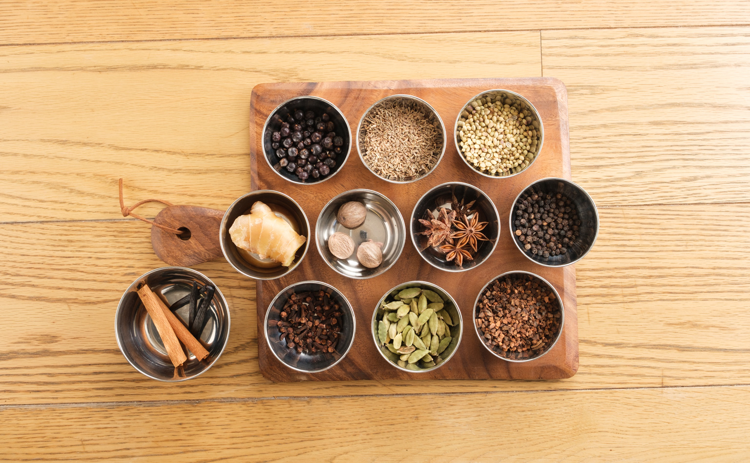 • 下段(左から):シナモンスティック、バニラビーンズ、クローブ、カルダモン、コーラナッツ
