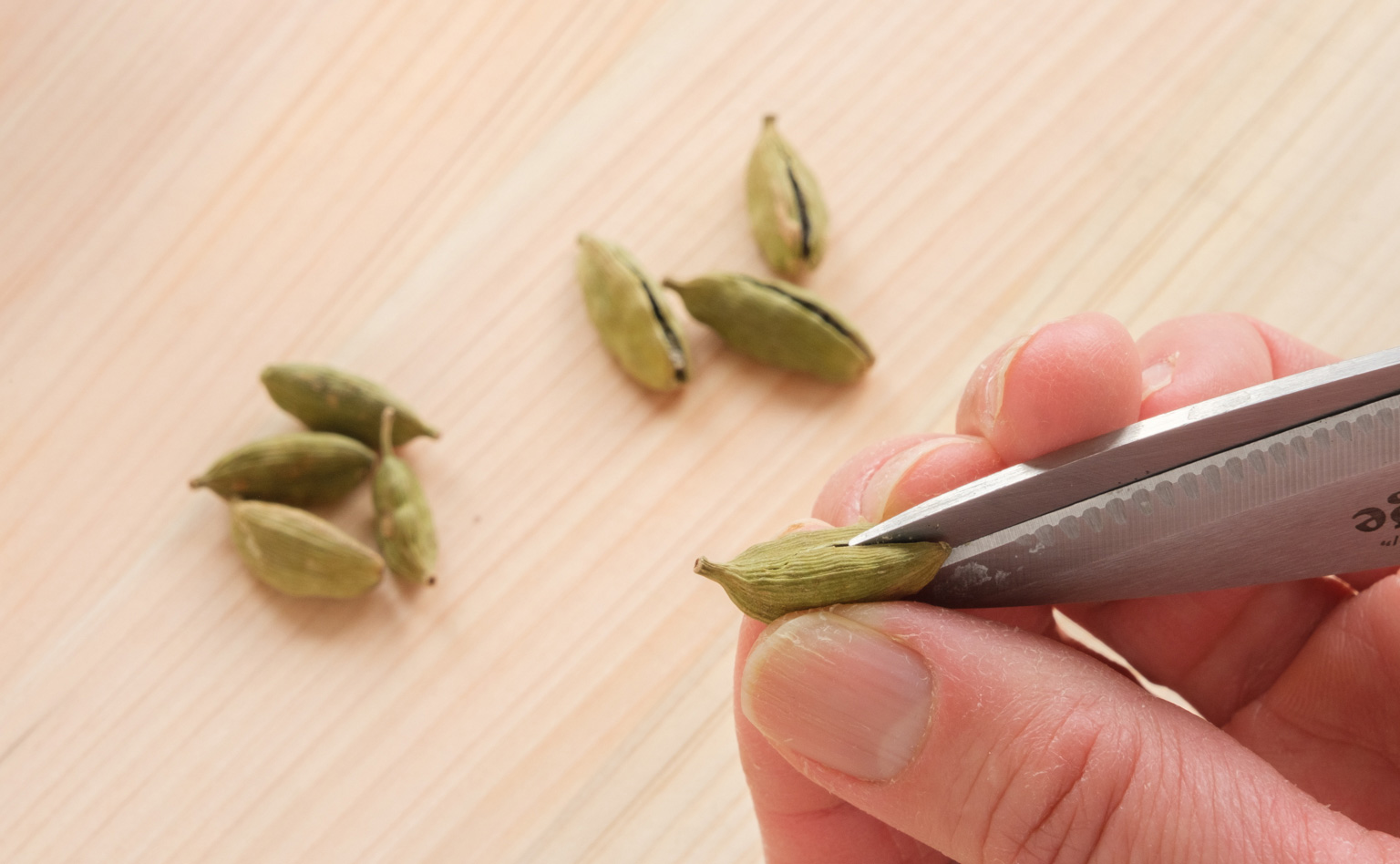 ▲さやに切れ目を入れることで、中の種から香りが出やすくなります