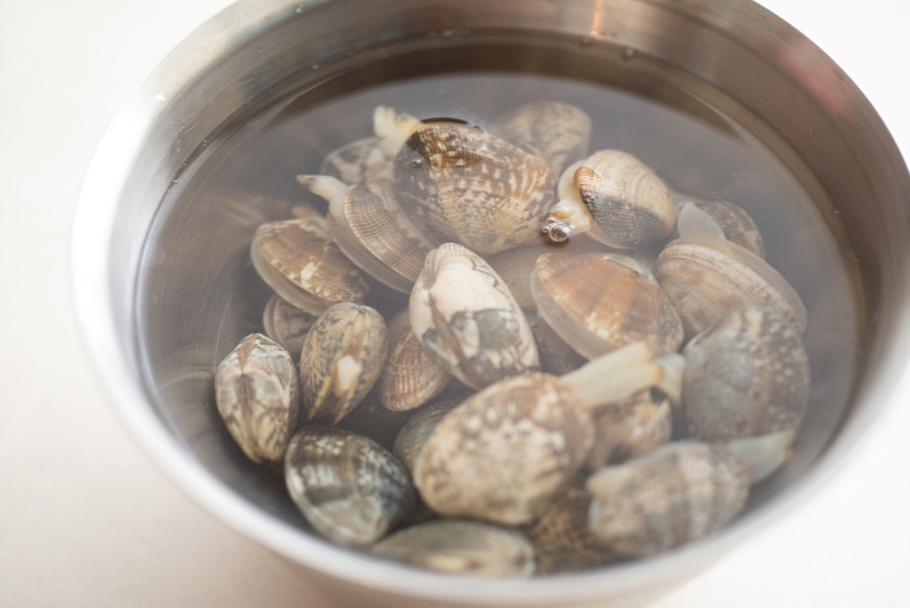あさりの砂抜きは面倒なイメージがありますが、50℃くらいのお湯に入れると、たった5分で砂抜きができるんです。お湯の温度はわざわざ計らなくて大丈夫! ぱっと指を入れてみたときに、お風呂よりちょっと熱めでぎりぎり入れられるくらいの温度が目安です。お湯をぐらぐら沸かして同量の水と合わせると、だいたい50℃になるのでおすすめです。