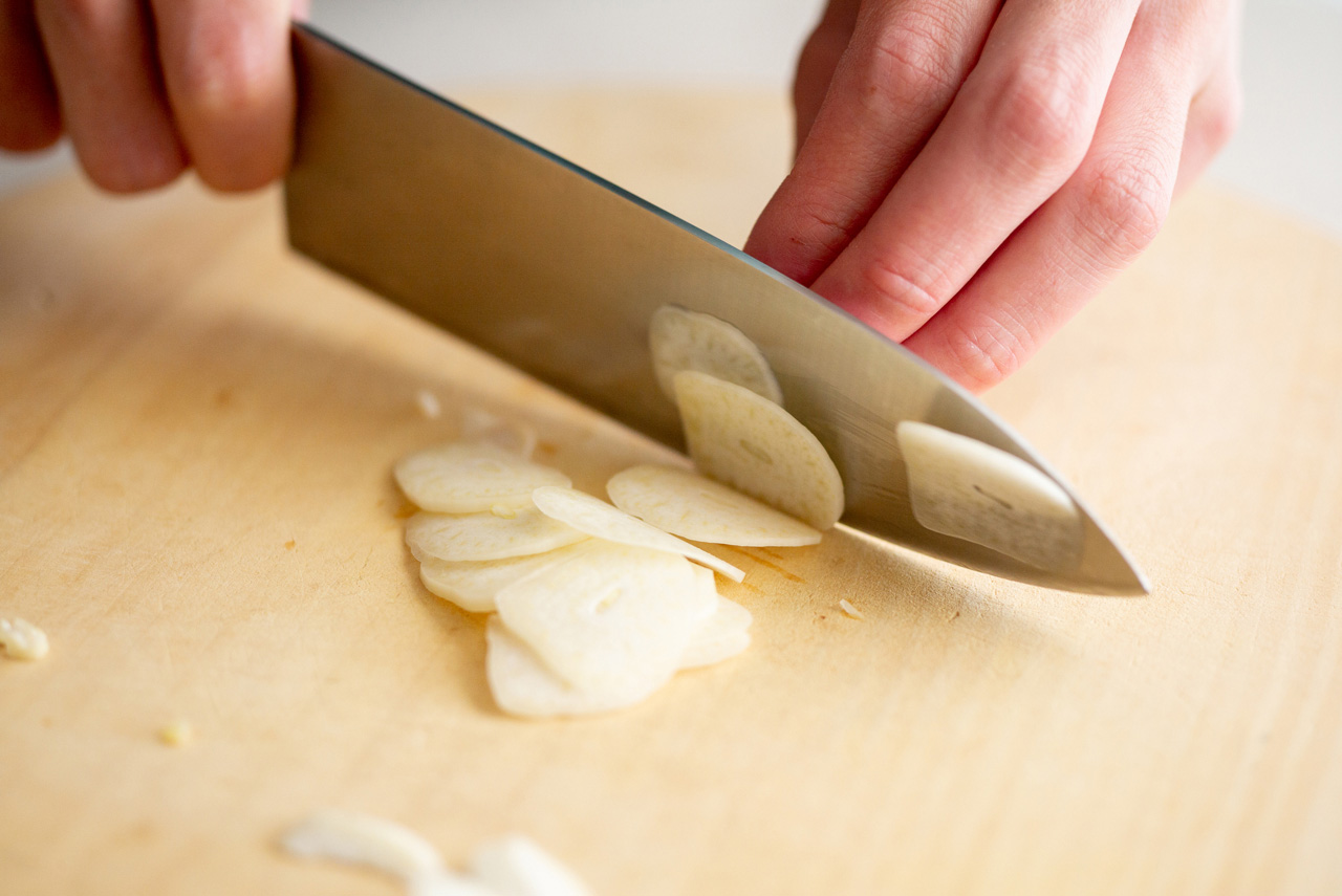 具材として少し食感を残しておきたいので、みじん切りではなくスライスにカットします。新にんにくの場合は、もっとごろっと感を出して1/2くらいにカットするといいですよ!
