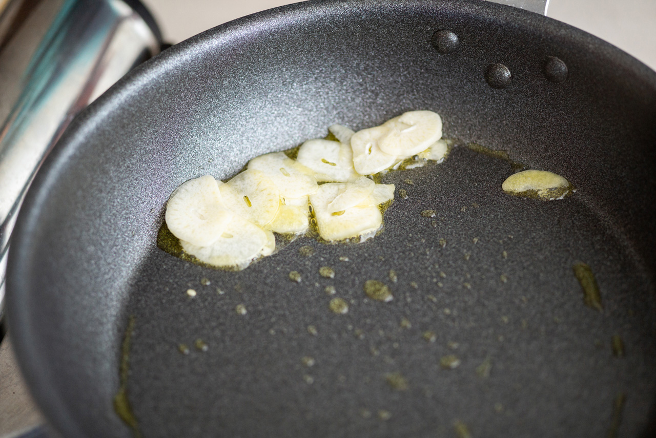 【3】フライパンにオリーブオイルとにんにくを入れて火を付け、弱火でじっくり加熱する。