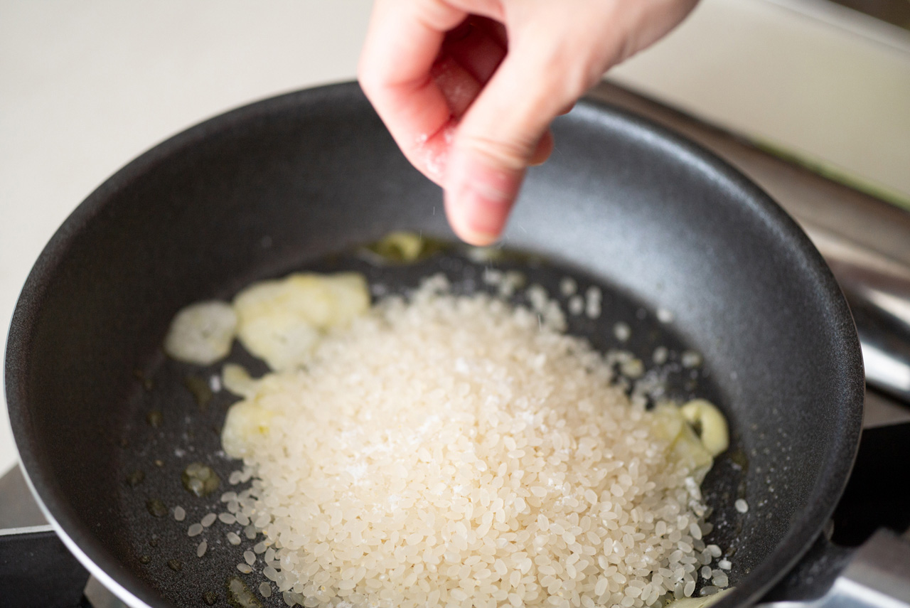 【4】にんにくの良い香りがしてきたら、米と塩ひとつまみ(分量外)加え、弱めの中火で、透明になるまでさらに炒める。
