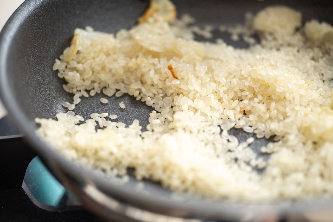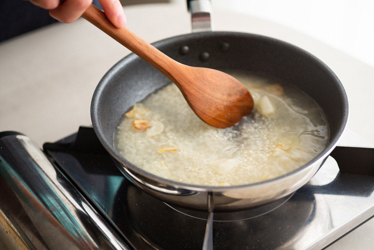 この工程でオリーブオイルににんにくの香りを移しておくと、このあと入れるお米にもしっかりと浸透します。今回は22cmのフライパンを使っていますが、少し深さのあるフライパンであれば、他のサイズでも大丈夫です。