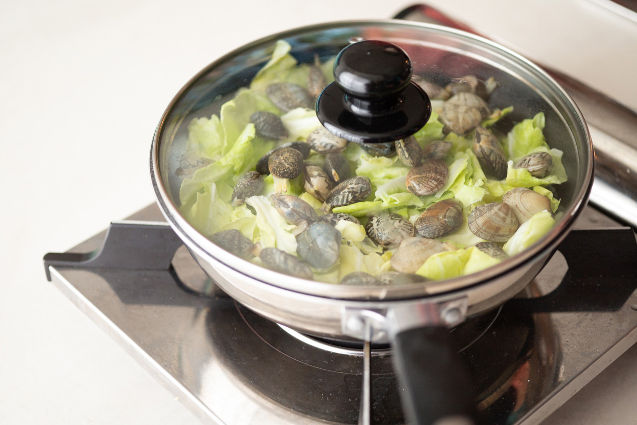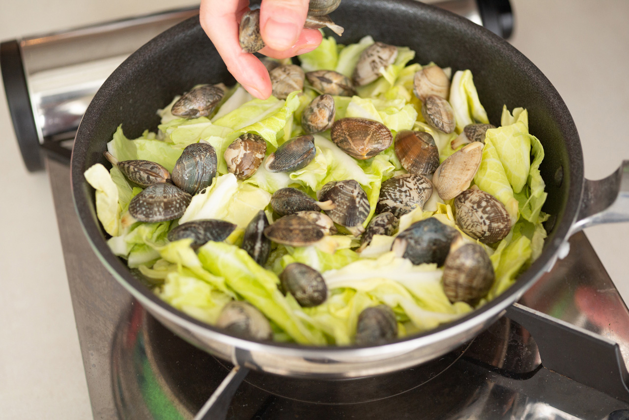 【6】あさりをキャベツの上にのせたらフタをして、弱めの中火にかける。沸騰したら火を弱めて計20分加熱して、最後に黒こしょうをかける。