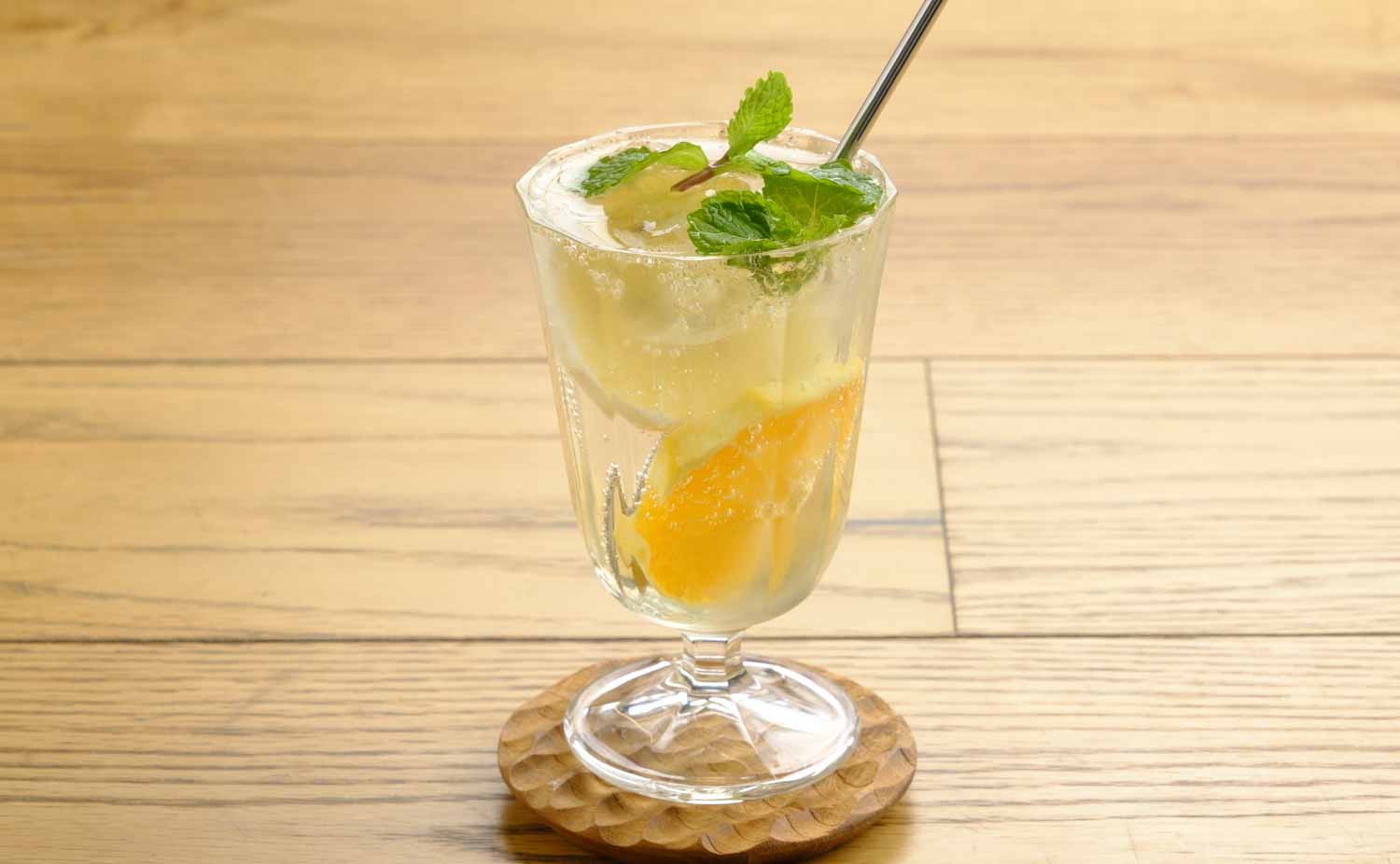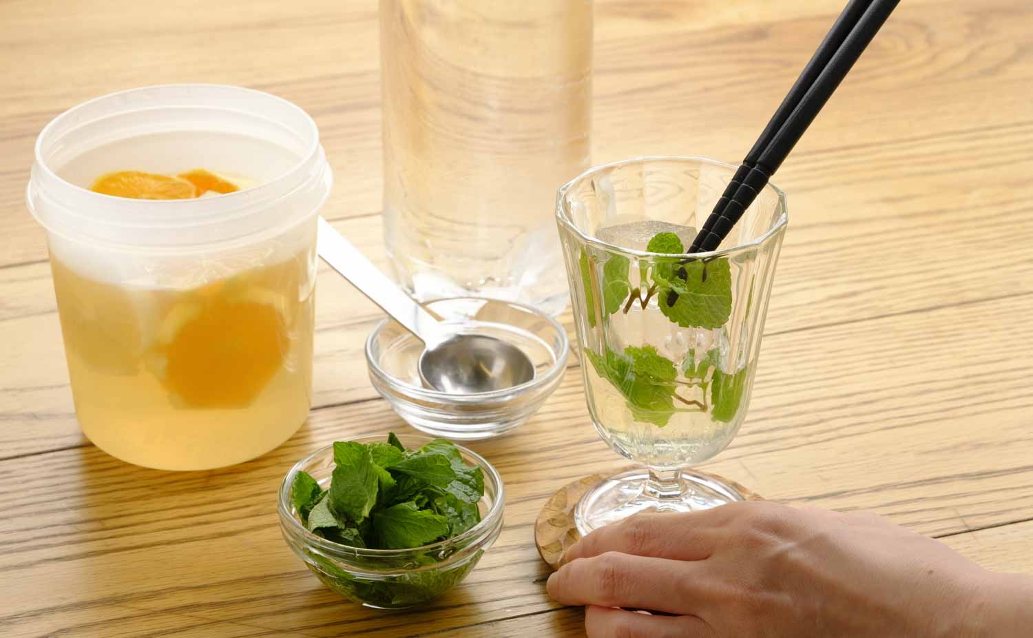飲み頃になったら、グラスにシトラスビネガー適量(大さじ2~3程度)氷、お好みでミントを入れ、水または炭酸水を注いで楽しみましょう!