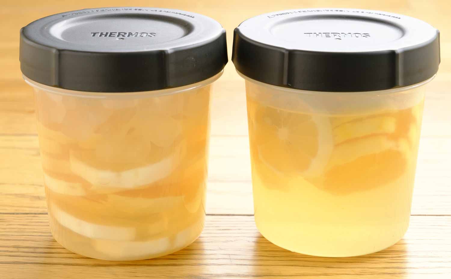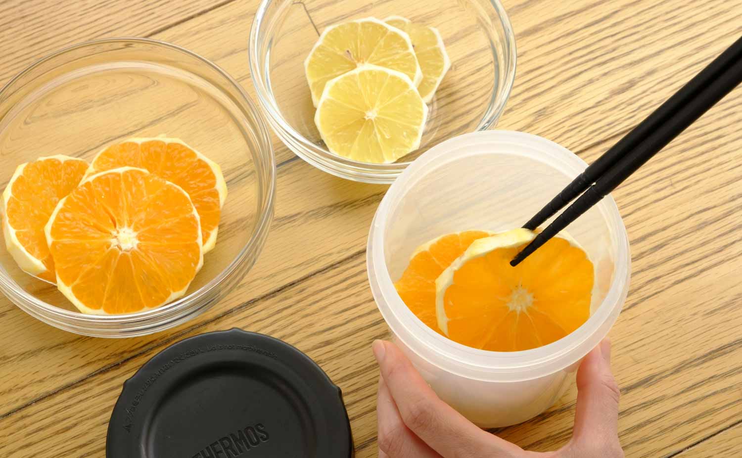 使うフルーツによって変わります。変色しやすいりんごや果肉がやわらかいキウイなどは最初に漬けた時と状態が変わるので、1週間程度で取り出して食べるといいですね。フルーツによっては漬けている間に白っぽいアクのようなものが浮いてくることがあるので、フタを開けて取り除いてください。今回のオレンジやレモンなどのシトラス系は変化がほとんどないので漬け込んだままでも大丈夫。美味しく食べられます。