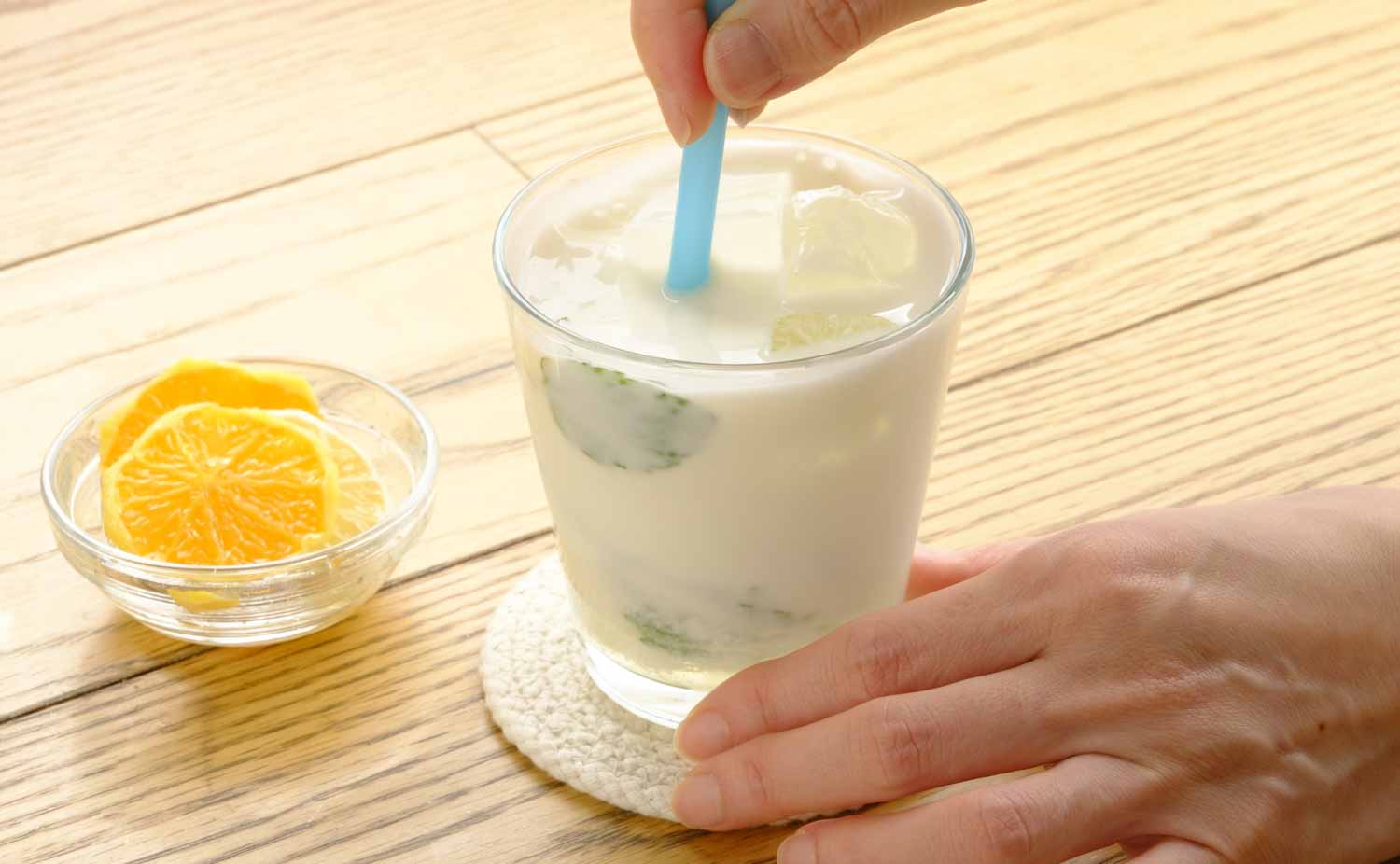 牛乳に含まれるたんぱく質がフルーツビネガーの酸に反応して固まり、混ぜるととろみがつきます。ラッシーのような味わいが楽しめますよ。漬けたフルーツを刻んで入れると、彩りのアクセントにもなります。