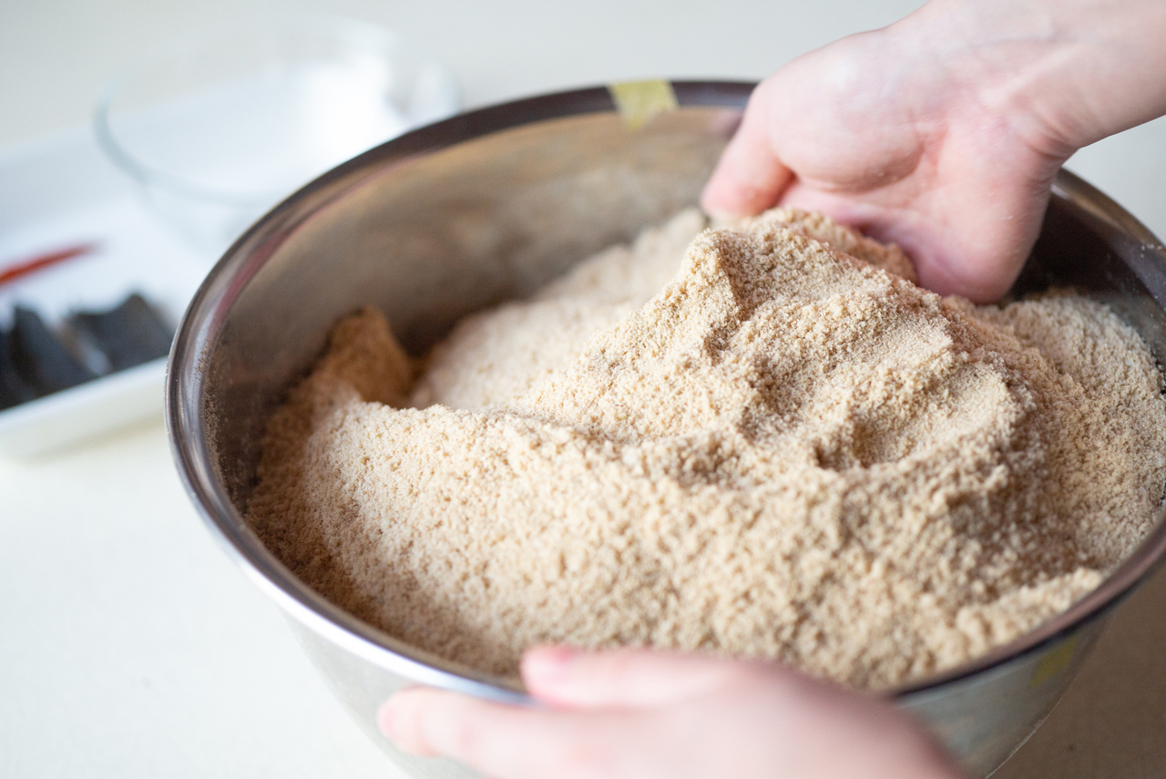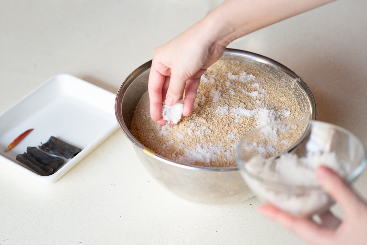 塩とぬかは次の工程でもしっかり混ぜ合わせるので、この段階では、少しムラになっていても問題ありません。