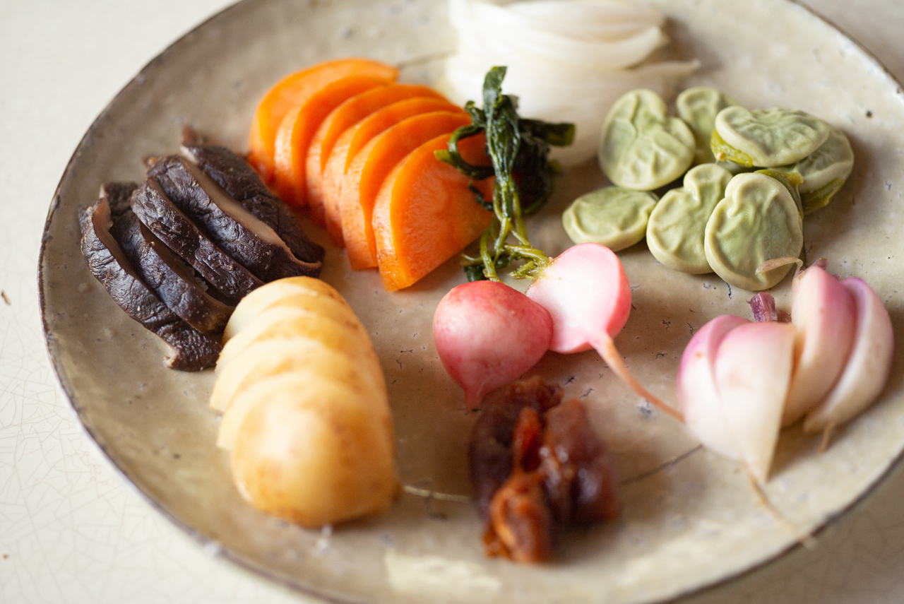 にんじんやカブなど、アクが少ない野菜は生のまま漬けています。ジャガイモは固めにふかしてから。そら豆は薄皮ごと、サッと茹でてから漬けました。そら豆は小粒なので、お茶パックやキッチンネットなどに入れて漬けると迷子になりにくいです。