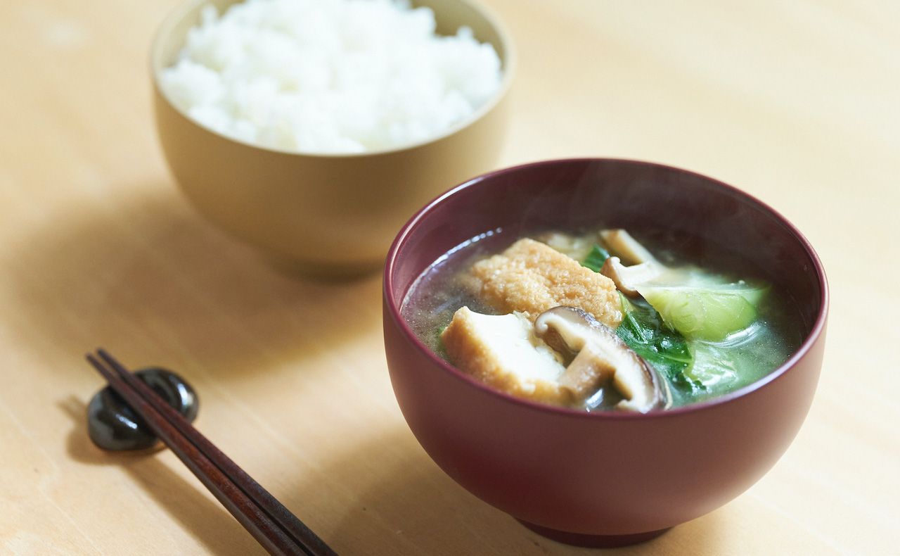 ▲撮影日もお味噌汁を作ってもらいました。具材は「チンゲン菜、しいたけ、厚揚げ」。