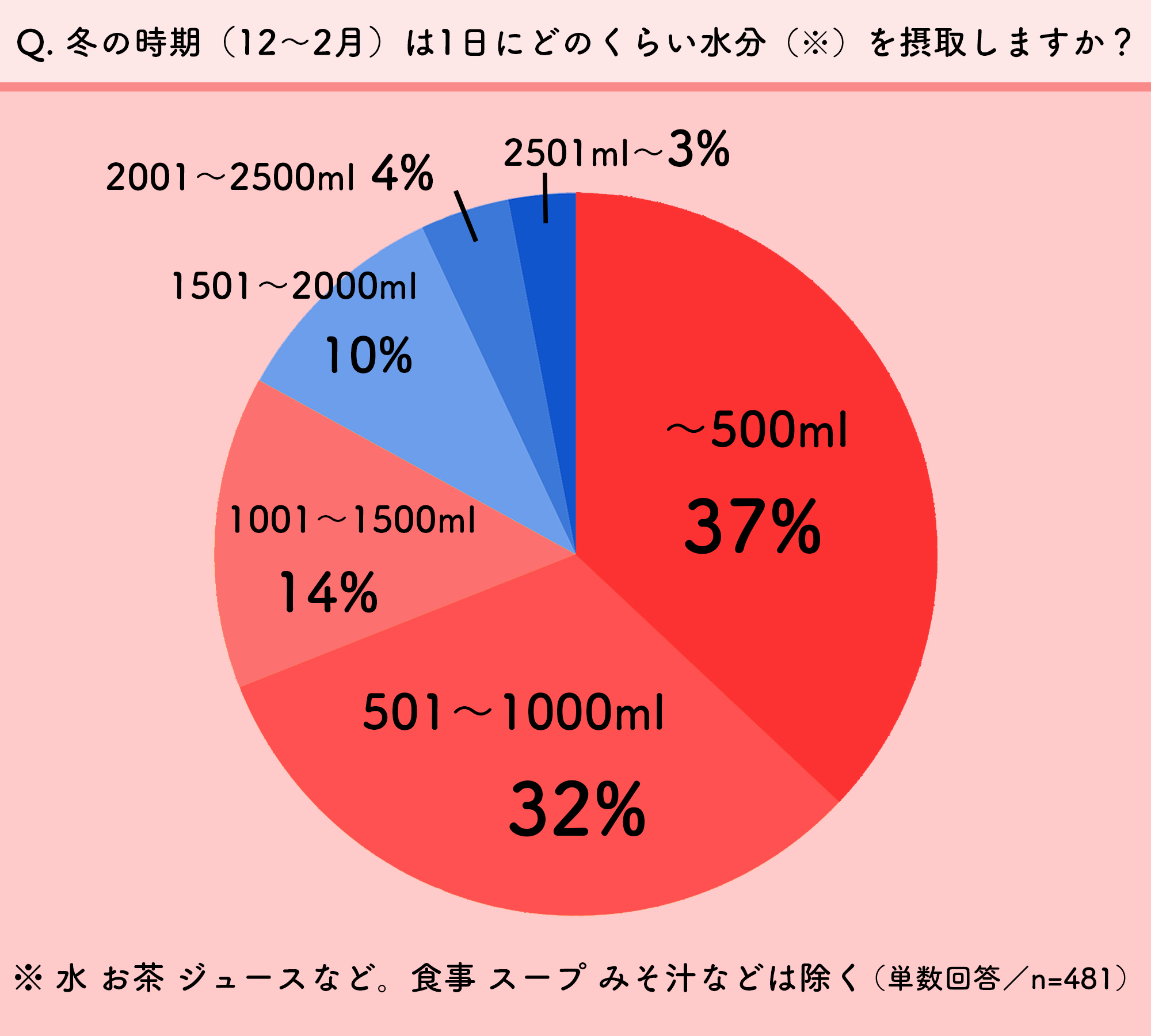 また、1日の水分摂取量が500ml以下と答えた人も、全体の37%にのぼりました。厚生労働省が推奨する1日当たりの水分摂取量は1.2L(※)。冬の時期は水分が足りてない人が多いようです。