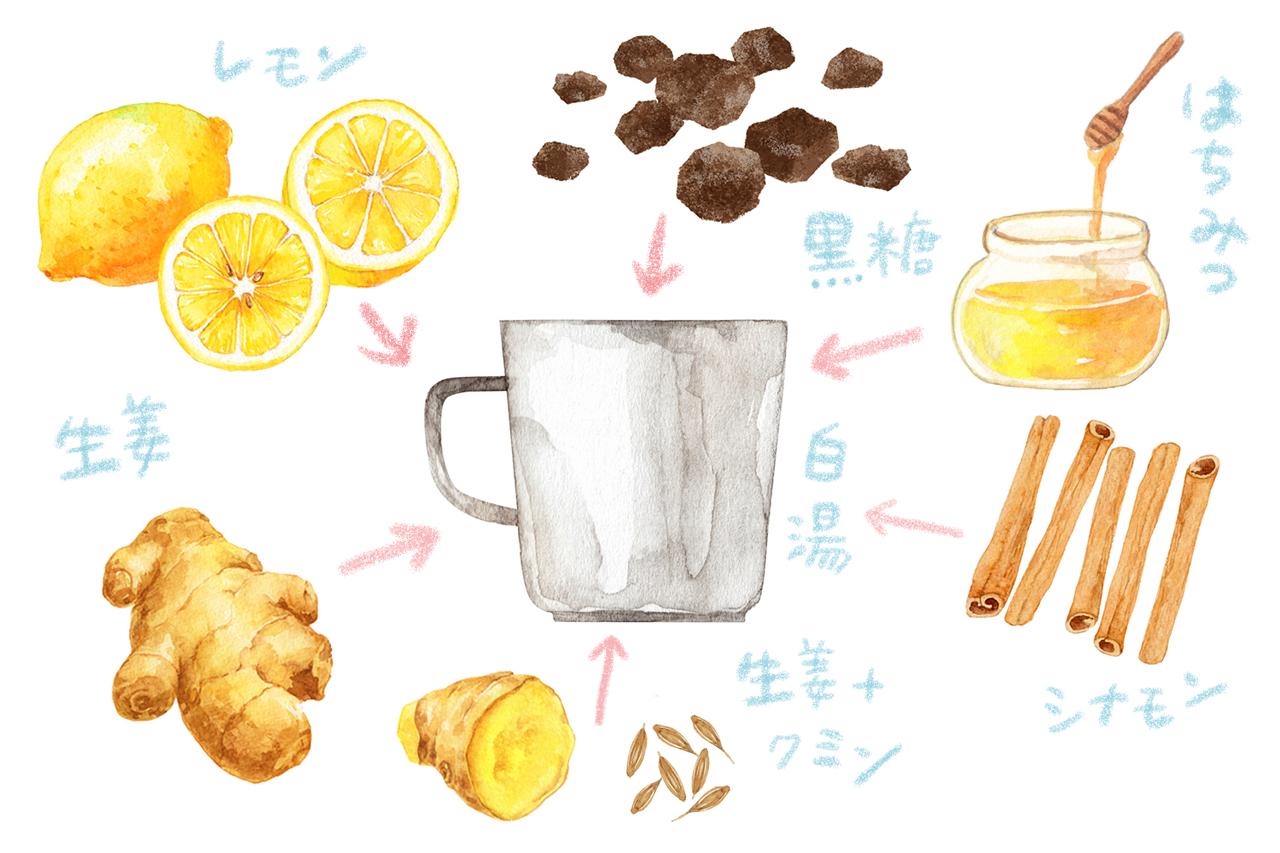 白湯に、ビタミンやカリウム、ポリフェノールを含む「レモン」、もしくは身体を温めてくれる「はちみつ」や「黒糖」を入れるだけでOKです。それから、「生姜」「生姜+クミン」「シナモン」などを入れた「スパイス白湯」も、豊かな香りを感じられておいしいですよ。