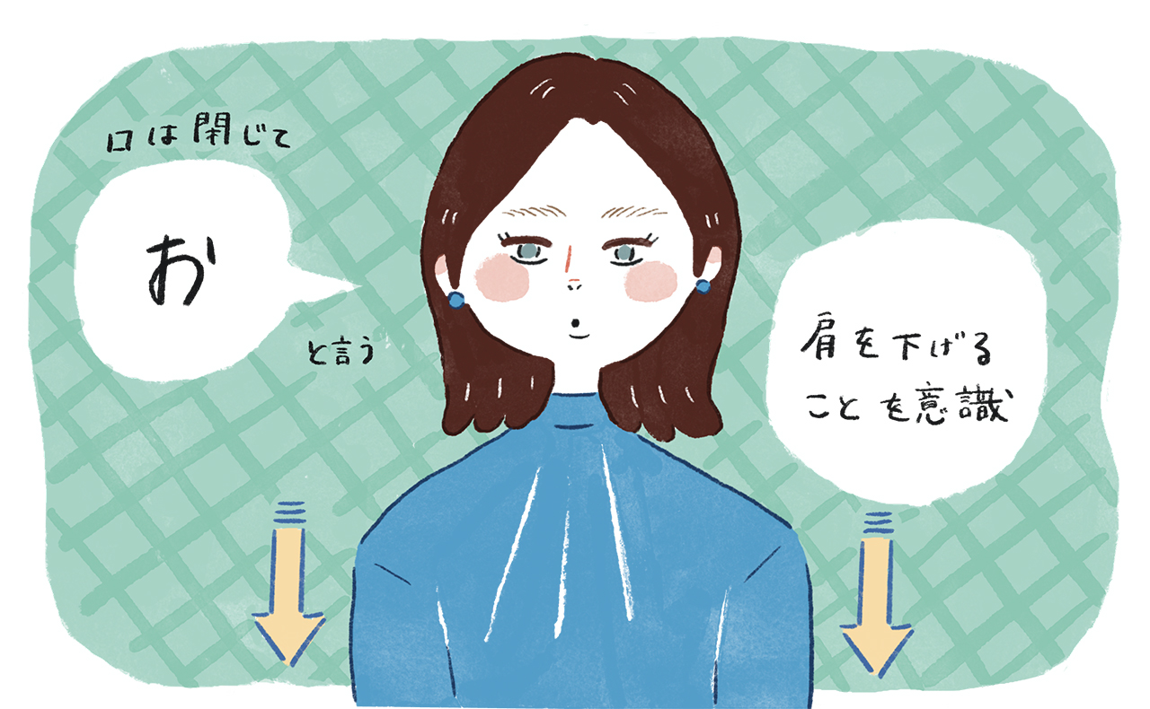 舌骨から肩甲骨までは筋肉で繋がっているため、舌骨に力が入ると肩も上がってきます。だから、肩を下げることも意識しましょう。