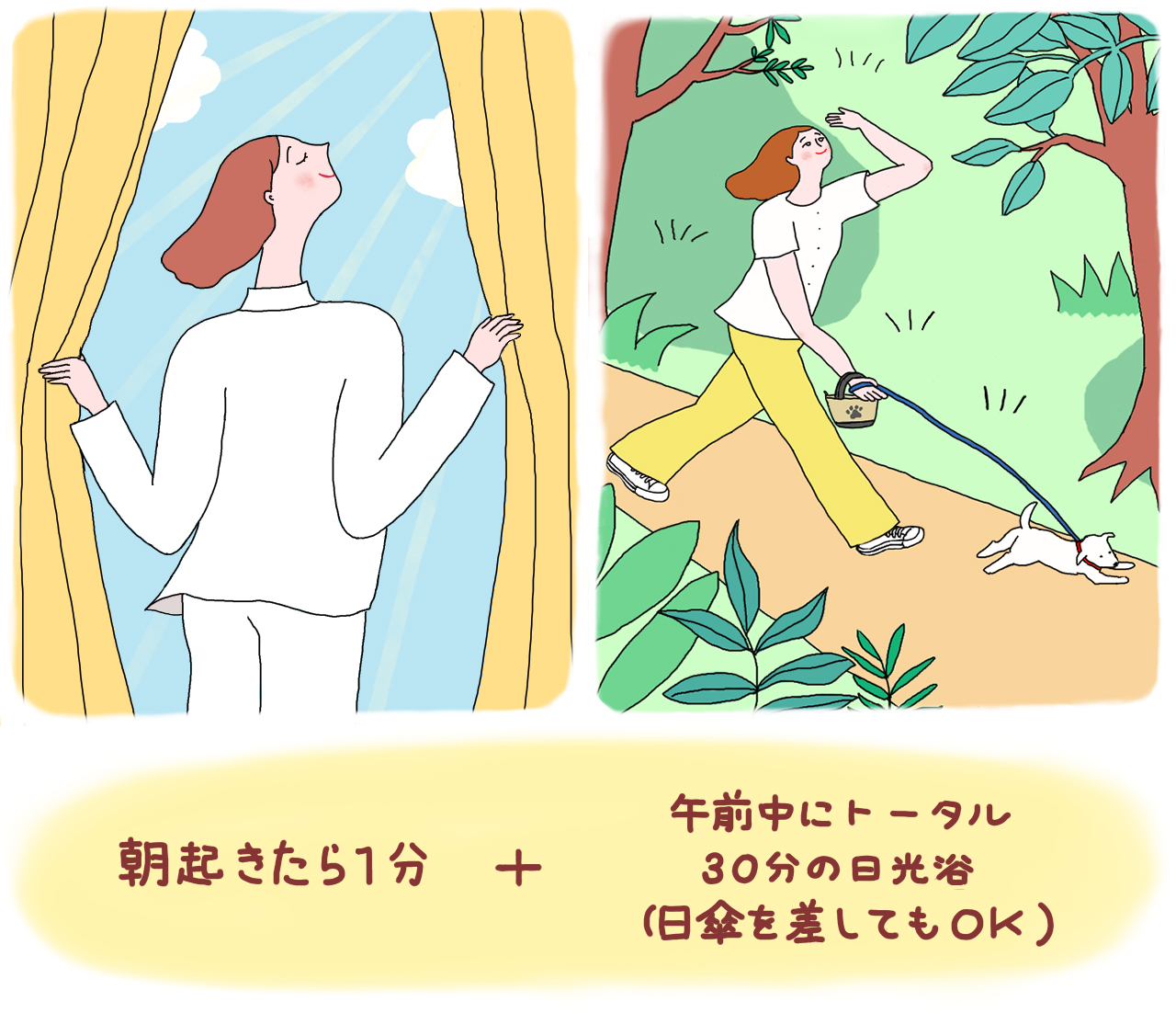 まず朝起きたら、太陽の光を1分くらい浴びましょう。そのあとも、ベランダで洗濯物を干したりスーパーに行ったりと小刻みでもいいので、午前中にトータルで30分以上は太陽光を浴びてください。ベランダや窓際で朝ごはんを食べるのもおすすめです。
