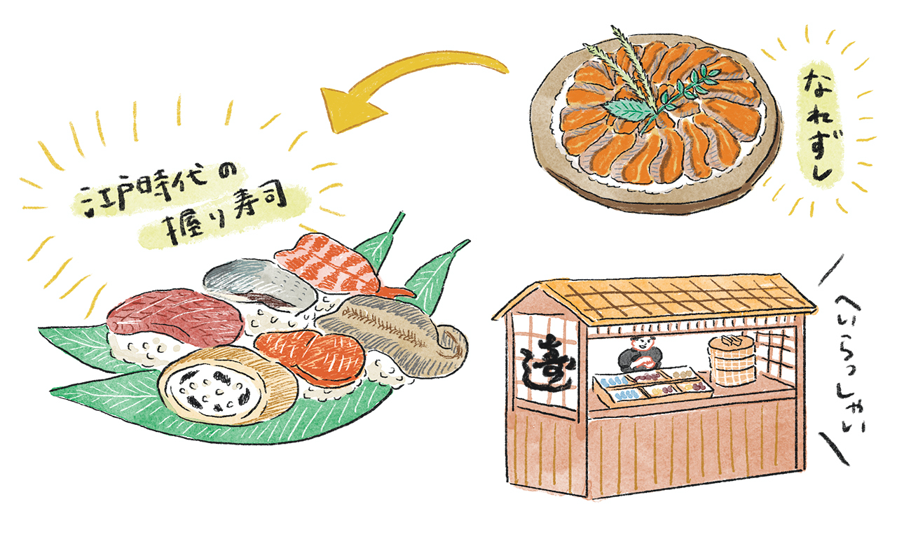 ちなみに、お寿司もまた長い歴史を持つ食品ですが、伝来した当初はいまの姿とはまったく異なるものでした。お寿司のご先祖様は、塩と米麹で発酵させてつくった、酸っぱくてドロドロした『なれずし』という魚のお漬物。たくさん獲れた魚を保存するためにつくられていました。