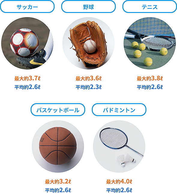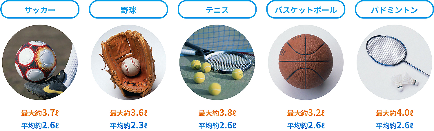 男子高校生の夏場の部活動(2~3時間)中、汗などによって失われる水分量の例。気温約30℃前後・湿度約60~80%の真夏の環境下での実験による。環境、練習量、個人差など諸条件によって前後します。