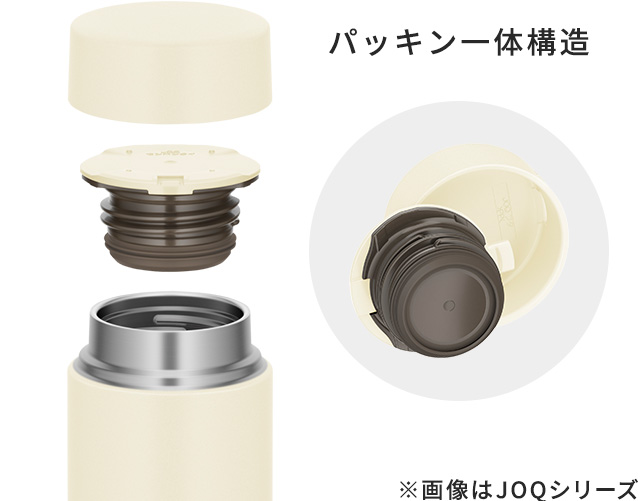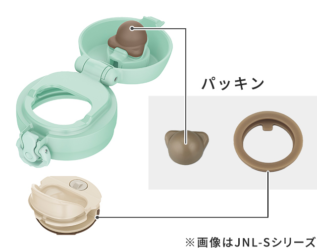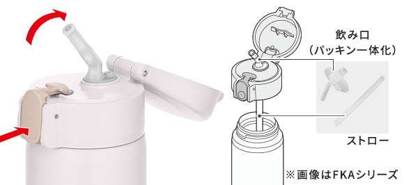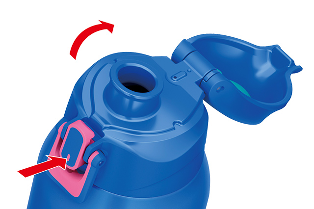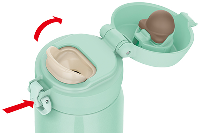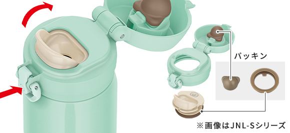 ボタンを押すだけでフタを簡単に開けられる一番人気の構造です。開けたフタをどこかに置かなくて良いのも便利。飲み口やパッキンなどのパーツは付け外ししやすく、洗いやすいように工夫されています。