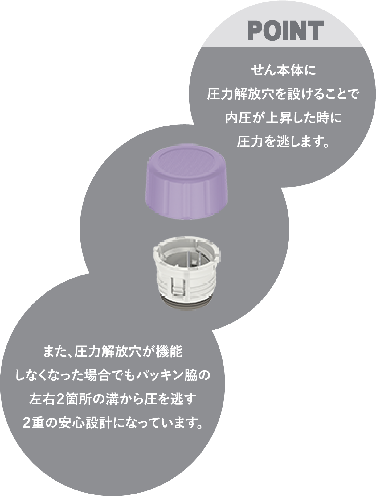 POINT せん本体に圧力解放穴を設けることで内圧が上昇した時に圧力を逃します。また、圧力解放穴が機能しなくなった場合でもパッキン脇の左右2箇所の溝から圧を逃す2重の安心設計になっています。
