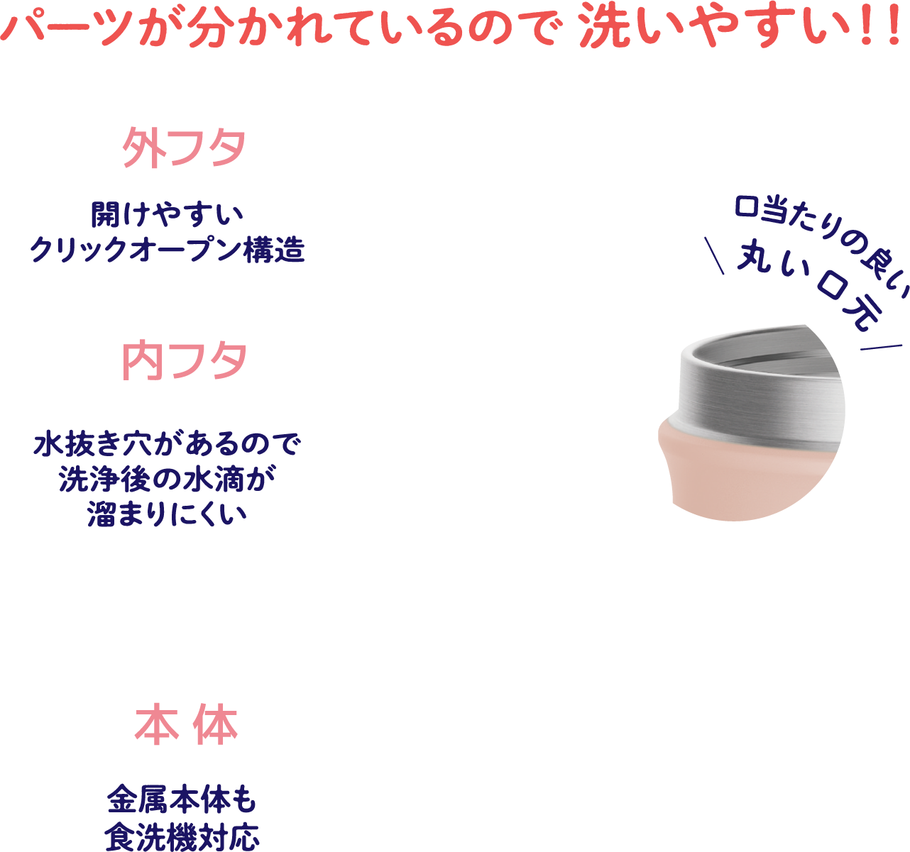 パーツが分かれているので洗いやすい! 外フタ 開けやすいクリックオープン構造 内フタ 水抜き穴があるので洗浄後の水滴が溜まりにくい 本体 金属本体も食洗機対応 口当たりの良い丸い口元