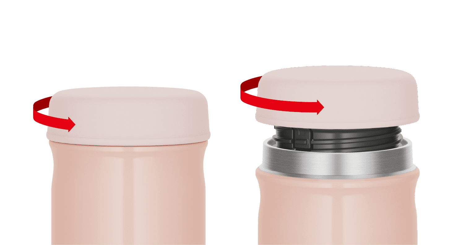クリックオープン構造 フタの開けやすさにこだわりました STEP1 フタを少し回すとクリック構造が中の圧力を逃がします STEP2 さらにフタを回すとフタが開きます