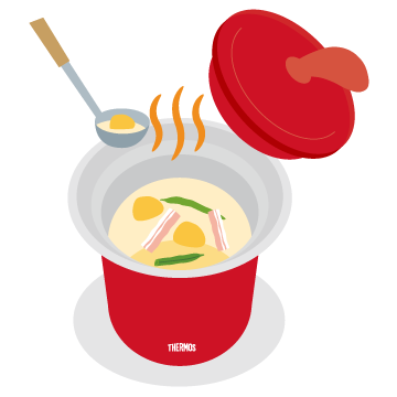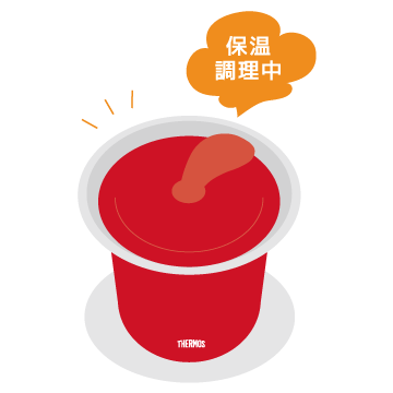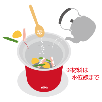 2ステップのカンタン調理スープの作り方はカンタンです。具材や調味料、沸騰したお湯などの材料を入れて、フタをするだけで保温調理。 そのまま保温もできるから温め直しも不要です。01・